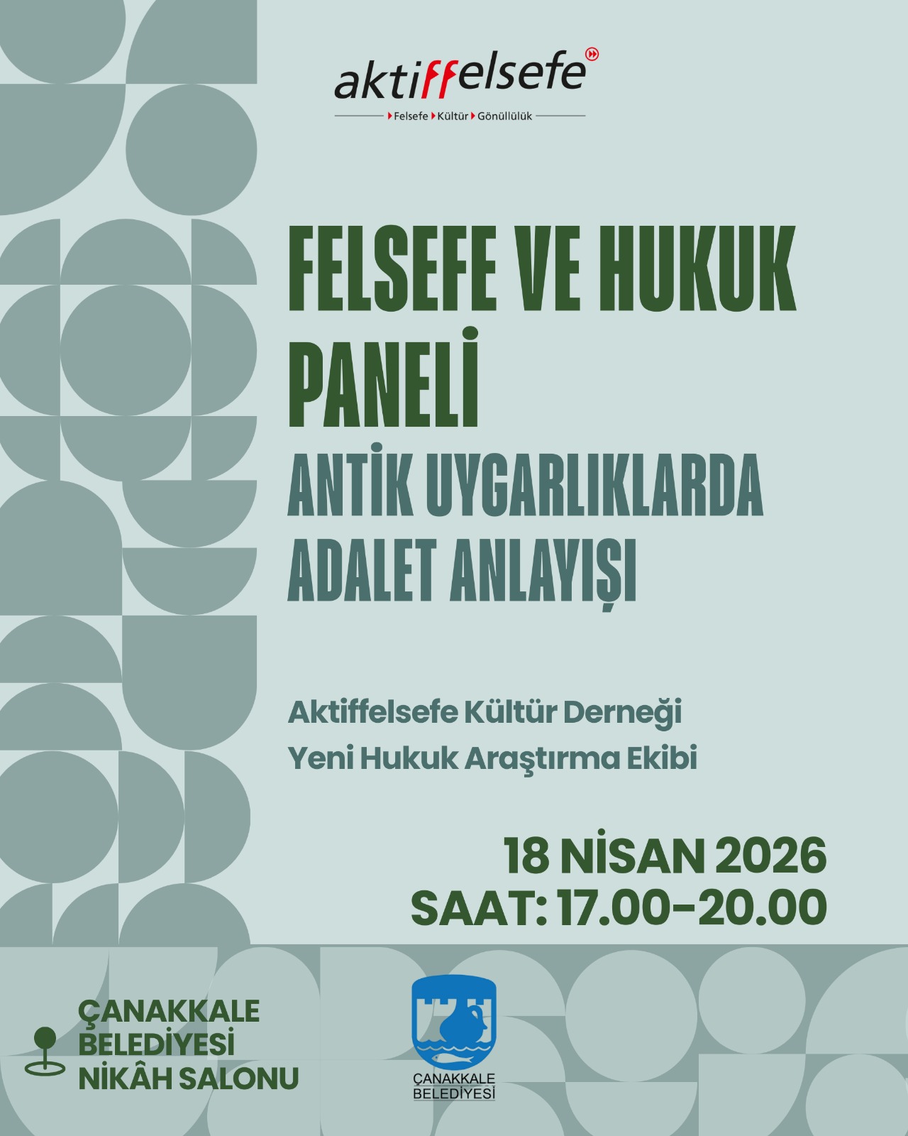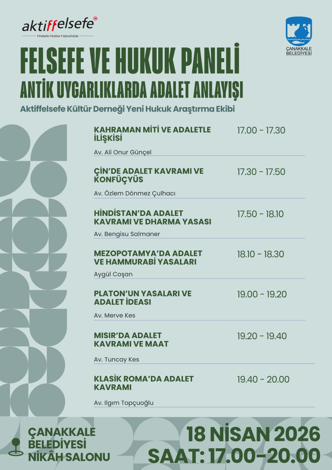 Antik uygarlıklarda adalet anlayışı paneli, antik toplumların adalet anlayışını inceleyerek, günümüz hukukunun temellerini anlamak, farklı uygarlıkların adalet anlayışlarını karşılaştırmak, adalet kavramının tarihsel gelişimini izlemek ve geleceğe projeksiyon yapmak bakımından bizlere farklı perspektifler sunmak üzere felsefe ve hukuk alanında çalışan Aktiffelsefe Kültür Derneği Yeni Hukuk Araştırma Ekibi üyelerince hazırlanmıştır.