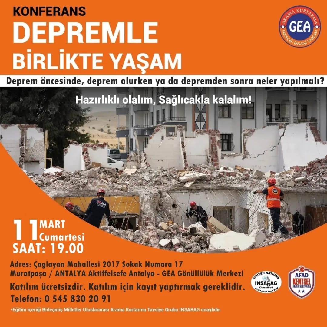 GEA Arama Kurtarma Antalya ekibi olarak gerçekleştireceğimiz ücretsiz DEPREMLE BİRLİKTE YAŞAM eğitimine sizi ve sevdiklerinizi davet ediyoruz.