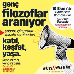 Yaz sonrası yeni bir seminer grubu açmanın heyecanı ile beraber tekrar hayatın ve felsefenin derin sularına iniyoruz. Uzun yıllardır büyük ilgi gören, güncel adı ile “Yaşam İçin Pratik Felsefe Seminer Dizimiz”e başlamak üzere; kendini ve doğayı tanımak, derinleşmek, öğrenmek ve araştırmak isteyen; felsefi bir alt yapısı olsun/olmasın herkesi davet ediyoruz.